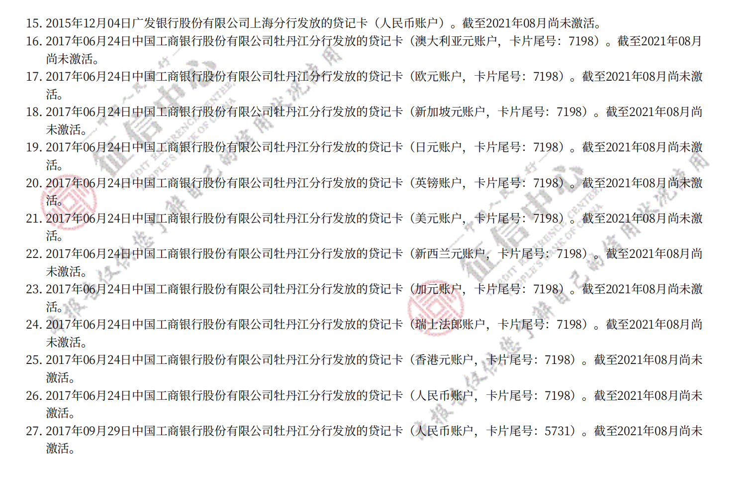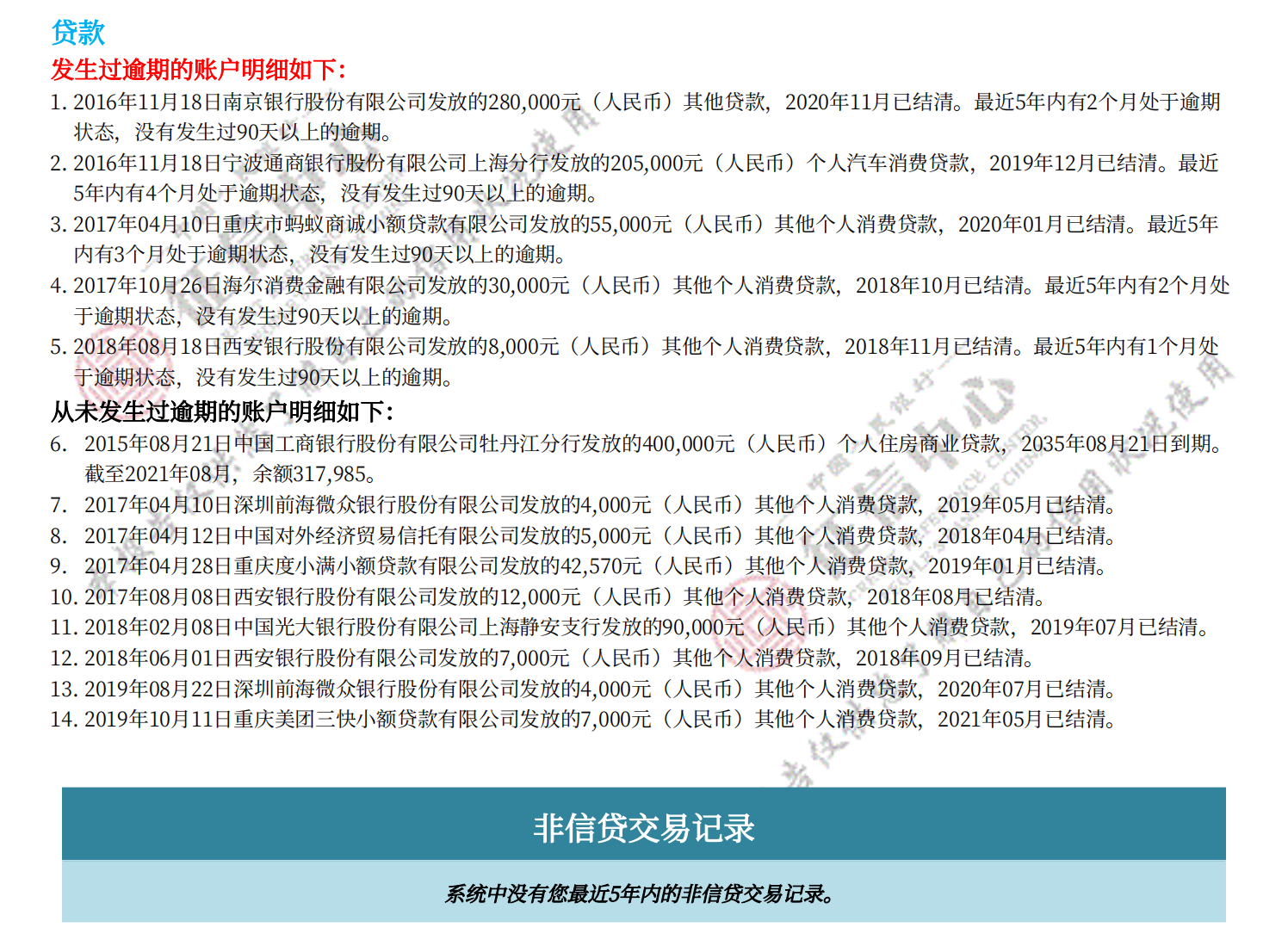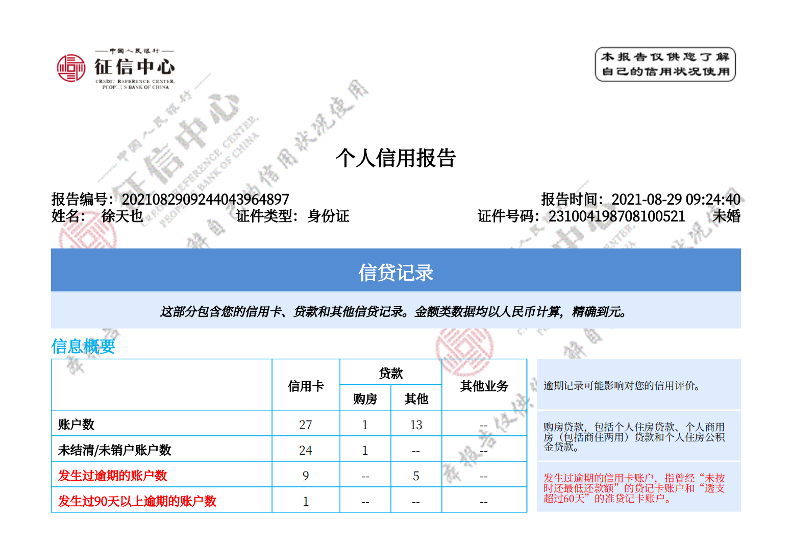 • 1. 个人信用报告:根据个人的信用信息,生成个人信用报告,包括个人基本信息、信用卡使用情况、贷款记录、逾期记录等内容。